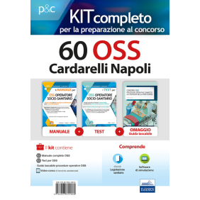 Uno strumento completo per la preparazione alla prova preselettiva, alla prova pratica e alla prova orale del concorso per 60 OSS presso il Cardarelli di Napoli, pubblicato in G.U serie concorsi del 28 agosto 2018, n. 68. Il kit è composto dai volumi: il Manuale per OSS, manuale completo per la preparazione a tutte le prove selettive (scritte, pratiche e orali); i Test per OSS contenente un'ampia raccolta di quesiti a risposta multipla con soluzioni commentate, quiz per la prova pratica sulle procedure assistenziali per prove pratiche, quiz completi di simulazione della prova reale. In omaggio con l'acquisto del pacchetto: la Guida tascabile delle procedure assistenziali per OSS (formato cartaceo); un software di simulazione on line per effettuare infinite esercitazioni; un ebook contenente la Legislazione regionale in materia sanitaria ed un Video-corso di tecniche assistenziali per operatori socio-sanitari.