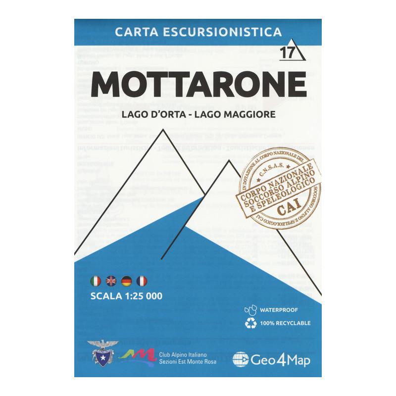 La carta escursionistica Geo4Map del Mottarone n° 17 è realizzata in scala 1:25.000 con sistema di riferimento UTM/WGS84 zona 32N, con un'ampia rappresentazione del territorio: formato aperto di cm. 104 x 76, formato chiuso cm 19 x 13, a colori. Stampata su carta Stone Paper composta da polvere di pietra, estremamente durevole, idrorepellente, anti riflesso. Le curve di livello a 20 metri, i particolari rocciosi disegnati a mano, i colori e i simboli sono solo alcune delle caratteristiche che permettono di leggere facilmente la cartografia. Nel retro sono stati inseriti una puntuale tabella dei sentieri e importanti nozioni di orientamento e primo soccorso in italiano, inglese, tedesco e francese.