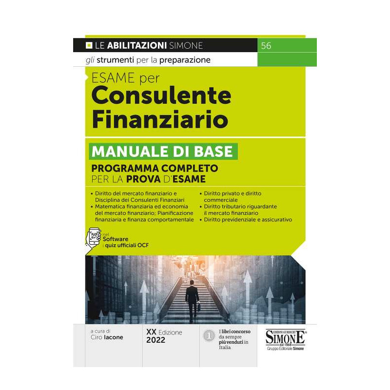 Il manuale per l'esame di consulente finanziario, giunto alla XX edizione, è indirizzato agli aspiranti consulenti che intendono affrontare la prova valutativa prevista per l'abilitazione. Il testo è, infatti, strutturato tenendo conto degli argomenti richiesti dal bando d'esame e si articola in cinque parti di cui si elencano, a grandi linee, i contenuti: Diritto del mercato finanziario e degli intermediari e Disciplina dei Consulenti Finanziari: abusi di mercato, appello al pubblico risparmio, disciplina dell'Albo unico dei consulenti finanziari, emittenti e società con azioni quotate, gestione collettiva del risparmio, normativa antiriciclaggio, mercati degli strumenti finanziari, Organismo di vigilanza, provvedimenti sanzionatori e cautelari, deontologia professionale, servizi e attività di investimento, vigilanza su mercati e intermediari, trasparenza delle condizioni contrattuali e dei rapporti con i clienti ecc.; Nozioni di matematica finanziaria e di economia del mercato finanziario; Pianificazione finanziaria e finanza comportamentale: analisi di scenario, costruzione del portafoglio, fondi comuni di investimento, futures, opzioni, strumenti derivati, strumenti di mercato monetario, strumenti e operatività di banche e altri intermediari finanziari, swap, titoli azionari, titoli strutturati, valutazione delle obbligazioni; Nozioni di diritto privato e di diritto commerciale: beni e diritti reali, contratto in generale, contratti tipici, obbligazioni, rapporti patrimoniali tra coniugi e impresa familiare, risoluzione e invalidità del contratto, titoli di credito, impresa, scritture contabili e bilancio, società di capitali, società di persone, vicende modificative della società e operazioni straordinarie ecc.; Nozioni di diritto tributario riguardanti il mercato finanziario: aspetti del sistema tributario, tassazione degli strumenti del risparmio gestito, tassazione degli strumenti di investimento diretto, tassazione indiretta dei redditi finanziari; Nozioni di diritto previdenziale e assicurativo: aspetti civilistici del contratto, aspetti tecnici, attuariali e finanziari, aspetti tributari, intermediari assicurativi, compiti dell'Istituto per la vigilanza sulle assicurazioni, principi assicurativi, TFR, previdenza complementare, previdenza pubblica, imprese di assicurazione, tipologie di rami e polizze ecc. A corredo del testo, tra le espansioni online, il software di simulazione della prova valutativa con i quiz ufficiali OCF.