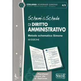 Gli schemari Simone seguono i programmi tradizionali degli Atenei ponendosi come sussidio del manuale adottato per: delineare un quadro sistematico della materia; identificare, al pari delle «slides», i punti chiave e le linee generali della disciplina; dedicare maggiore attenzione agli argomenti «caldi» più frequentemente oggetto di domande d'esame; facilitare la lettura, agevolare la memorizzazione, velocizzare il ripasso. I volumi sono strutturati in pagine staccabili per essere facilmente inserite negli schedari a fogli mobili utilizzati per prendere appunti durante le lezioni. In particolare, gli Schemi & Schede di Diritto Amministrativo costituiscono, per quanti si apprestano ad affrontare questa complessa disciplina, un utile supporto per la propria preparazione. Il lavoro, strutturato in tavole sinottiche e schemi articolati, presuppone già una conoscenza di base della materia e si raccomanda la contestuale consultazione del manuale istituzionale. Questa XII edizione si giova di una veste grafica più accattivante ed affianca agli schemi tre differenti rubriche: osservazioni, che approfondisce aspetti rilevanti della disciplina; differenze, che analizza aspetti particolari della materia, stimolando i confronti e i paralleli fra i diversi istituti; in sintesi, che offre un quadro riepilogativo degli argomenti affrontati.