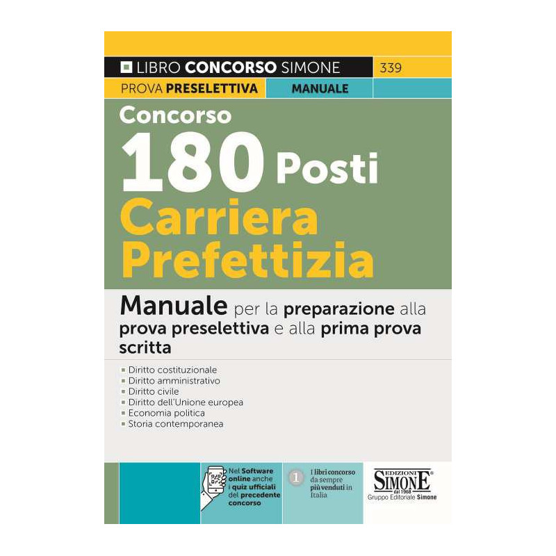 Il manuale Concorso 180 Posti Carriera Prefettizia è diretto alla preparazione della prova preselettiva e della prima prova scritta previste per il concorso bandito dal Ministero dell'Interno (in G.U. 28-12-2021, n. 103). Seguendo il programma del bando, il testo è stato così strutturato: Parte I - Diritto costituzionale; Parte II - Diritto amministrativo; Parte III - Diritto dell'Unione europea; Parte IV - Diritto civile; Parte V - Economia politica; Parte VI - Storia contemporanea. Sono, inoltre, a disposizione degli utenti espansioni online di approfondimento e un software con migliaia di quiz, compresi quelli ufficiali oggetto del precedente concorso, grazie al quale è possibile esercitarsi in vista della prova preselettiva. Per completare la preparazione della prima prova scritta si consiglia lo studio del compendio: Storia della Pubblica Amministrazione (cod. 4/3), materia questa oggetto della prima prova scritta. Tutte le informazioni sul Concorso Carriera Prefettizia 2022: requisiti e titoli di studio, modalità di presentazione della domanda, prove e bando.