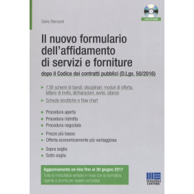 La pubblicazione del nuovo Codice dei contratti, D.Lgs. 18 aprile 2016 n. 50, ha segnato una tappa fondamentale nell'evoluzione della disciplina riguardante gli appalti pubblici. Lo scopo di questo volume è fornire l'insieme, organico e facilmente fruibile, della copiosa modulistica necessaria ad attuare gli istituti giuridici previsti dal nuovo Codice, in ambito di procedure aperte, ristrette, negoziate, sopra e sotto soglia, con riferimento al criterio del prezzo più basso e dell'offerta economicamente più vantaggiosa, in relazione agli appalti di servizi e di forniture. Oltre alla modulistica dedicata specificamente a ciascuna procedura vengono proposti modelli comuni, utilizzabili per differenti procedure d'appalto.