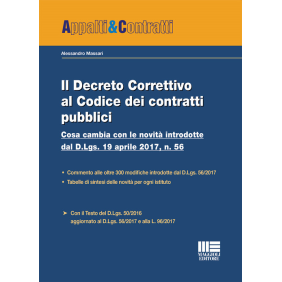 Il D.Lgs. 19 aprile 2017, n. 56, recante "Disposizioni integrative e correttive al decreto legislativo 18 aprile 2016, n. 50", introduce oltre 300 modifiche al Codice dei contratti pubblici, non solo formali, ma di ampia portata e sostanza, finalizzate, come si dà conto nella Relazione illustrativa, "a perfezionare l'impianto normativo senza intaccarlo, con lo scopo di migliorarne l'omogeneità, la chiarezza e l'adeguatezza in modo da perseguire efficacemente l'obiettivo dello sviluppo del settore che la stessa legge delega si era prefissata". Le novità si sviluppano su alcune linee direttrici piuttosto evidenti: minori vincoli ed oneri per gli operatori economici nelle strategie di aggregazione (RTI, consorzi) e misure pro MPMI; semplificazione delle procedure (infra 40.000 euro, ampliamento criterio del prezzo più basso per i lavori, alleggerimento del regime per i servizi dell'allegato IX, ecc.); valorizzazione degli appalti sostenibili (obbligatorietà dei criteri ambientali per qualunque importo e delle clausole sociali per le procedure sopra soglia, tutela rafforzata del costo del personale); innalzamento misure di trasparenza e prevenzione (inasprimento requisiti generali, commissione giudicatrice solo parzialmente interna anche sotto soglia, limiti subappalto, ecc.); favor per i professionisti dei servizi tecnici (vincolatività tariffe per base di gara, conferma dei limiti all'appalto integrato, compenso svincolato dal finanziamento dell'opera, divieto di ricorrere alla sponsorizzazione, ecc.). Il volume intende offrire un primo strumento di analisi delle numerose innovazioni e questioni introdotte dal D.Lgs. 56/2017. Sono riportate tabelle di sintesi per ciascun istituto e una tabella finale riepilogativa.
