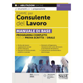 Il volume, giunto alla XVI edizione, fornisce una trattazione organica e rigorosa delle materie previste per l'esame di abilitazione alla professione, costituendo un efficace testo per la preparazione. La linearità dell'esposizione, i diversi corpi e caratteri di stampa, i numerosi schemi esemplificativi e di sintesi, frutto dell'esperienza del Gruppo editoriale Simone nel settore dei concorsi e della manualistica, si rivelano di concreta utilità per l'apprendimento di discipline complesse e talvolta ostiche. Il testo è aggiornato ai numerosi provvedimenti che hanno riguardato le materie di studio, tra cui la L. 178/2020 (legge di bilancio 2021), il D.L. 137/2020 conv. in L. 176/2020 (decreto Ristori) e il D.L. 41/2021 conv. in L. 69/2021 (decreto Sostegni). In corso di stampa e stato poi emanato il decreto Sostegni-bis (D.L. 25-5-2021, n. 73), di cui daremo conto, mediante espansioni on-line accessibili tramite QR Code all'interno del libro, dopo la conversione in legge. Oltre che per la preparazione all'esame di abilitazione, il libro Esame per Consulente del Lavoro è utile anche per i partecipanti ai corsi di formazione alla professione di Consulente del lavoro.