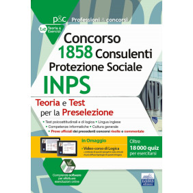 Questo volume è rivolto a quanti intendono prepararsi alla prova preselettiva del concorso per 1858 Consulenti Protezione Sociale nell'INPS. Il testo riporta una trattazione manualistica delle materie previste per la prova preselettiva: test psicoattitudinali e di logica, lingua inglese, competenze informatiche e cultura generale. Per ciascuna di tali materie il volume offre una sintesi, ragionata ed esaustiva, di tutto il programma e una nutrita serie di quesiti a risposta multipla (disponibili online) che consentono una verifica e un allenamento in vista della prova preselettiva. Una sezione del volume è dedicata alla risoluzione e ai commenti dei quesiti ufficiali del concorso per 967 Consulenti Protezione Sociale nell'INPS. Un'ulteriore sezione (disponibile online) è dedicata alla risoluzione e ai commenti dei quesiti ufficiali del concorso per 365 Analisti di processo nell'INPS. Tra il materiale disponibile online, anche un Video-corso di Logica (oltre 20 ore di lezioni). Il volume è corredato di un software online, basato su un database di oltre 18.000 quesiti, che consente infinite simulazioni della prova di preselezione.