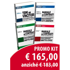 Il kit comprende 4 volumi: Manuale dei contrasti. Diritto civile; Manuale dei contrasti. Diritto penale; Manuale dei contrasti. Diritto amministrativo; I temi dei vincitori. Civile, penale, amministrativo.