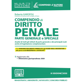 Il "Compendio di diritto penale. Parte generale e speciale" di Roberto Garofoli si inserisce nella collana "I compendi d'autore", destinata a chi si appresta alla preparazione degli esami orali per l'università, per avvocato, per il concorso di magistrato e per i concorsi pubblici. Il volume fornisce una analisi completa e, tuttavia, sintetica e schematica, della disciplina, degli istituti di parte generale e speciale, con segnalazione anche della giurisprudenza più significativa illustrata in appositi focus. Il compendio è stato redatto per agevolare una rapida memorizzazione con l'esposizione "per punti" delle principali tesi emerse in dottrina e in giurisprudenza sulle questioni più problematiche: è frequente, inoltre, l'uso di grassetti e corsivi per i concetti-chiave di ogni singolo istituto; consente, infine, di saggiare il livello di preparazione, fornendo, per ciascun capitolo, le domande più probabili e ricorrenti su cui è utile che gli aspiranti avvocati, magistrati, funzionari e dirigenti si esercitino.