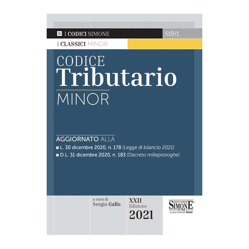 Il Codice Tributario Minor giunge nel 2021 alla XXII edizione. Completezza e accuratezza, aggiornamento puntuale, maneggevolezza e felicità di consultazione sono punti di forza di questo codice, che costituisce uno strumento di lavoro essenziale e «comodo» per professionisti, studenti universitari, partecipanti a pubblici concorsi e per coloro che si preparano in vista dell'esame di abilitazione per commercialista, esperto contabile e consulente del lavoro. Tra i provvedimenti di maggiore spessore riportati, ricordiamo: il D.L. 17-3-2020, n. 18, conv. in L. 27/2020 (c.d. Decreto cura Italia); il D.L. 19-5-2020, n. 34, conv. in L. 77/2020 (c.d. Decreto rilancio); il D.L. 14-8-2020, n. 104, conv. in L. 126/2020 (c.d. Decreto agosto); D.L. 28-10-2020, n. 137, conv. in L. 176/2020 (c.d. Decreto ristori); la L. 30-12-2020, n. 178 (Legge di bilancio 2021); il D.L. 31-12-2020, n. 183 (c.d. Decreto milleproroghe).