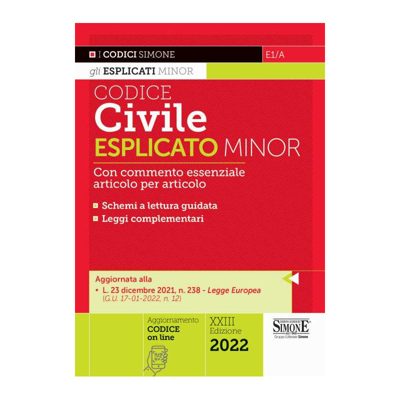 La collana dei codici Esplicati Minor costituisce un ulteriore strumento di studio e/o lavoro per quanti abbiano la necessità di consultare rapidamente un testo codicistico corredato da un agile commento esplicativo. In calce agli articoli del codice, infatti, sono riportate brevi annotazioni esplicative che facilitano la lettura delle singole norme guidando il lettore verso una immediata comprensione dello spirito e della lettera di ciascuna disposizione. A tal fine, inoltre, sono riportati in appendice una serie di Schemi a lettura guidata, sui principali argomenti e istituti: in particolare, a fronte di ogni schema, vengono presentate le definizioni delle «parole-chiave» in esso contenute. Il volume risulta particolarmente utile sia in affianco ai tradizionali testi di studio sia per una rapida consultazione della normativa codicistica che, grazie al formato pratico e maneggevole, può essere d'ausilio anche nelle aule giudiziarie. Un'accurata selezione di norme speciali: Adozione, Consumatore, Matrimonio e Divorzio, Persone giuridiche, Riforma della magistratura onoraria (la cui entrata in vigore è stata differita al 31-10-2025), Stato civile, Testamento biologico, Unioni civili e Convivenze, infine, completa e arricchisce il volume. Un ampio corredo di indici: sistematico, analitico-alfabetico e cronologico completa il volume e facilita la ricerca del dato normativo. Leggi complementari: Adozione; Consumatori (Contratti e garanzie); Matrimonio e divorzio; Persone giuridiche; Riforma della magistratura onoraria; Stato civile; Testamento biologico; Unioni civili e convivenze.