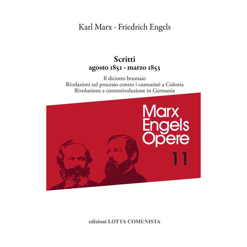 Il volume presenta scritti e documenti che appartengono o fanno riferimento al periodo compreso fra l'agosto del 1851 e il marzo del 1853. Sono raccolti contributi di grande valore storico, politico e soprattutto teorico. Fra tutti, senza ombra di dubbio, risaltano "Il diciotto brumaio di Luigi Bonaparte" di Marx e "Rivoluzione e controrivoluzione in Germania" di Engels. Ma in questo periodo uscirono anche lavori che sono immediatamente il risultato della battaglia di partito, come le "Rivelazioni sul processo contro i comunisti a Colonia". Da un punto di vista biografico, Marx ed Engels erano dal 1849 costretti all'esilio inglese, il primo a Londra e il secondo a Manchester. Le esigenze economiche portarono Engels a riprendere il suo posto nell'azienda familiare e Marx a dedicarsi al mestiere di giornalista, cercando di pubblicare "pezzi" per la stampa progressista e democratica internazionale. Il volume raccoglie i primi articoli di Marx per la "New-York Daily Tribune". C'era in quell'impegno anche un fondamento politico: la corrente comunista, ormai priva di un proprio organo di stampa, continuò a far sentire la propria voce attraverso gli articoli di Marx ed Engels.