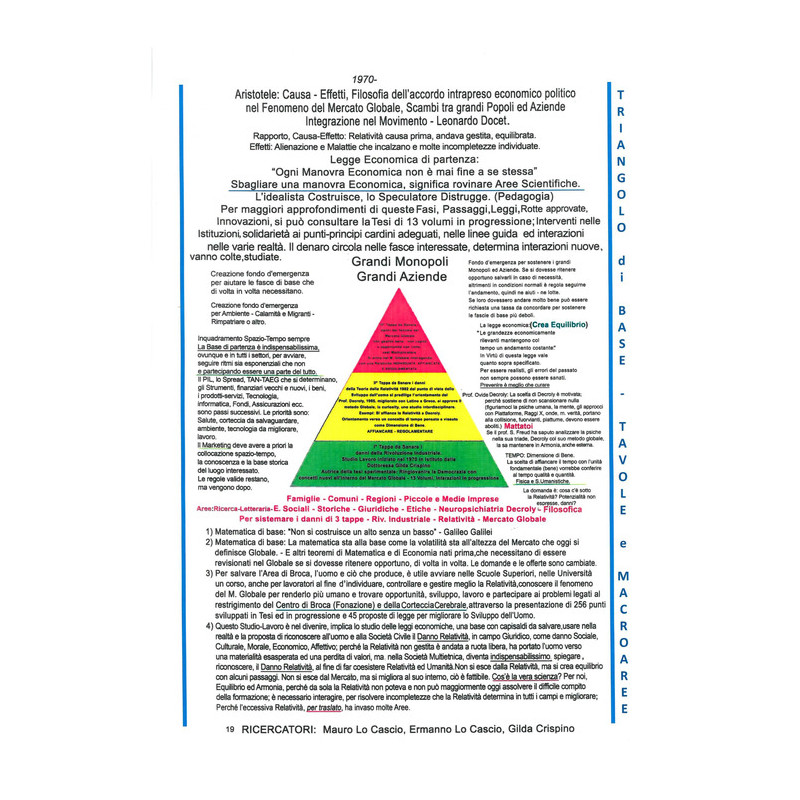Si presenta un triangolo di base ed un insieme di tavole formative con 320 punti - scoperte proposte- rotte, innovazioni, sintesi di una tesi di XXI volumi di ricerca iniziata nel 1987, per le macroaree: mercato globale - etica - scienze responsabili e dal locale al globale. Nel volume, si consiglia di individuare e gestire la relatività eccessiva ed assoluta, che è in natura ma va riequilibrata, deve essere affiancata con le unità fondamentali da trovare nelle diverse aree del sapere e realtà per non essere dannosa. Far coesistere, quindi relatività riequilibrata- valori- formazione più umana- capisaldi; bisogna saper prevenire non solo materialità figlia legittima della relatività assoluta, speculazione. Perché? La corteccia cerebrale è a rischio nei suoi centri funzionali - l'ecosistema rovinato - manca lavoro - la tecnologia va migliorata e regolamentata. Il triangolo, è anche la copertina del volume, ha una base per non sradicare - cause prime ed effetti - leggi economiche vere, un metodo esplorativo e si motiva il danno relatività in una integrazione nel divenire, come presentato dai ricercatori-autori: Gilda Crispino, Mauro Lo Cascio, Ermanno Lo Cascio.