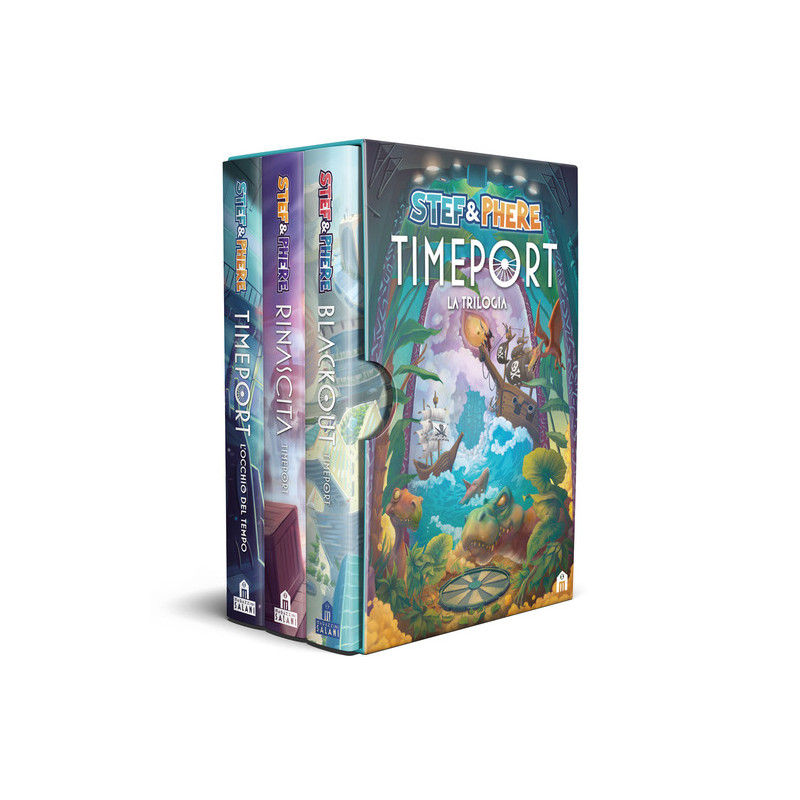 La raccolta definitiva della saga di Timeport Stef & Phere presentano il cofanetto che raccoglie tutte le avventure della trilogia di Timeport. Accompagna i protagonisti Thomas e Camilla in un incredibile viaggio: sopravvivi nella giungla e agli attacchi dei dinosauri in "Timeport. L'occhio del tempo"; affronta mostruosi zombie e temibili pirati in "Rinascita. Timeport"; salva il mondo che conosciamo dalla schiavitù tecnologica nel capitolo finale, "Blackout. L'ultimo mondo". Vivi queste emozionanti storie leggendo la trilogia firmata da Stef & Phere, raccolta in un cofanetto da collezionare. Età di lettura: da 12 anni.