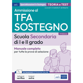 Manuale per la preparazione alle prove di ammissione al corso di specializzazione universitario per le attività di Sostegno Didattico nelle Scuole secondarie di primo e secondo grado. Il libro sviluppa i contenuti presenti nel programma ministeriale, a partire da un'accurata analisi delle prove ufficiali proposte dagli Atenei dal 2013 a oggi. La struttura del testo, nella suddivisione dei capitoli e nella successione degli argomenti, ricalca il programma ufficiale: competenze socio-psico-pedagogiche; competenze su empatia e intelligenza emotiva; competenze su creatività e pensiero divergente; competenze organizzative. Una sezione del volume ripercorre sinteticamente la storia dell'inclusione scolastica e, con l'ausilio della legislazione in vigore e delle classificazioni internazionali, definisce i principali disturbi cui è rivolta la didattica speciale. Nella parte finale sono presenti batterie di test tratti dalle prove ufficiali, che consentono di verificare le competenze acquisite. Con software di esercitazione.