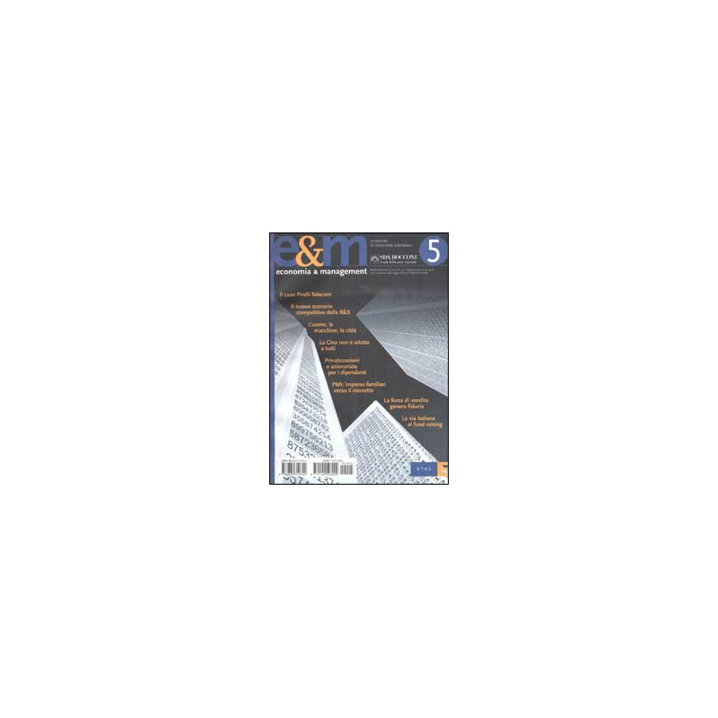 Si tratta del 5° numero del 2001 della rivista della Scuola di Direzione Aziendale Bocconi. Tra gli articoli di questo numero: Tecnologia e ricerca: quale contributo alla competitività del nuovo scenario? (a cura di E. Baglieri); La Cina non è adatta a tutti (W. R. Vanhonacker); Piani di azionariato dei dipendenti e processi di privatizzazione delle aziende di trasporto pubblico locale (A. Salvi); Le medie imprese familiari verso il riassetto normativo: quale impatto sui sistemi di governance (G. Brunetti, D. Montemerlo); Il ruolo della forza vendita nella generazione di fiducia. Un'indagine empirica (P. Guenzi); La via italiana al fund raising: intervento filantropia e reciprocità (V. Melandri, S. Zamagni).