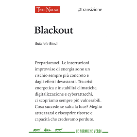Il blackout è l'inevitabile collasso di una civiltà sempre al limite delle proprie risorse, minacciata da sconvolgimenti climatici, crisi energetiche, e turbolenze politiche. Senza luce non avremmo cibo, acqua, telecomunicazioni, denaro e mezzi di trasporto. Ma il blackout è anche il collasso di una società che ha scommesso tutto sul digitale, illusa nell'eterno benessere e spaventata dalla perdita di controllo. La via della transizione tra nuova fiducia nelle rinnovabili e un ritrovato rapporto con il buio.