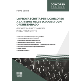 Il concorso a cattedre 2016 prevede una prova scritta nella forma di quesiti a risposta aperta, di cui una parte in lingua inglese. La prova è computer based e da concludersi nei limiti del tempo assegnato. Il presente volume costituisce una guida utilissima per prepararsi ad affrontare la prova scritta, in quanto presenta un'ampissima rassegna di quesiti a risposta aperta (ben 478), concernenti tutte le aree richieste dal bando in modo da simulare lo svolgimento della prova d'esame. I quesiti a risposta aperta proposti consentono al candidato di familiarizzare con la tipologia di prova da affrontare in sede d'esame, testando il proprio livello di preparazione e la propria capacità di rispondere alla tipologia di prova prescritta. Per assicurare la massima fruibilità, l'opera è suddivisa in dieci parti. Il testo, in conclusione, rappresenta per il candidato uno strumento di sicura utilità pratica per superare la prova scritta.