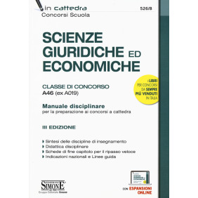Questo manuale è indirizzato a quanti vogliono affrontare le prove scritte e orali del concorso nella scuola per la classe di concorso A46 - Scienze giuridiche ed economiche (ex A019). L'opera ripercorre per punti e snodi essenziali tutto il programma d'esame delle discipline d'insegnamento delle Scienze giuridiche ed economiche e si completa di approfondimenti sulla didattica disciplinare. In particolare, il manuale è strutturato nelle seguenti Parti: Parte I. Discipline giuridiche, che analizza i caratteri generali dell'ordinamento giuridico, il diritto pubblico, il diritto amministrativo, l'ordinamento giuridico internazionale, il diritto commerciale e le discipline di settore (legislazione turistica, legislazione sanitaria, legislazione urbanistica, tutela dell'ambiente, diritto della navigazione); Parte II. Discipline economiche, che esamina l'economia politica e il sistema economico, il comportamento del consumatore, la produzione (prezzi e mercati), l'analisi del reddito nazionale, la moneta e il credito, lo sviluppo economico, le relazioni economiche internazionali, l'intervento pubblico in economia e l'attività finanziaria pubblica; Parte III. Metodologie didattiche per l'insegnamento del diritto e dell'economia che, applicando sul campo i nuclei teorici trattati nelle Parti precedenti, offre un supporto concreto finalizzato alla didattica e alla valutazione degli apprendimenti. Tutti i capitoli di cui si compongono le varie Parti presentano sintesi finali in cui vengono evidenziati, attraverso parole chiave, i contenuti fondamentali di ciascun capitolo al fine di favorire un rapido ripasso degli argomenti. Completano il testo le Indicazioni nazionali e le Linee guida (disponibili come Espansioni Web) riguardanti le discipline oggetto d'insegnamento della classe suddetta, indispensabili per una corretta progettazione di lezioni e unità d'apprendimento.