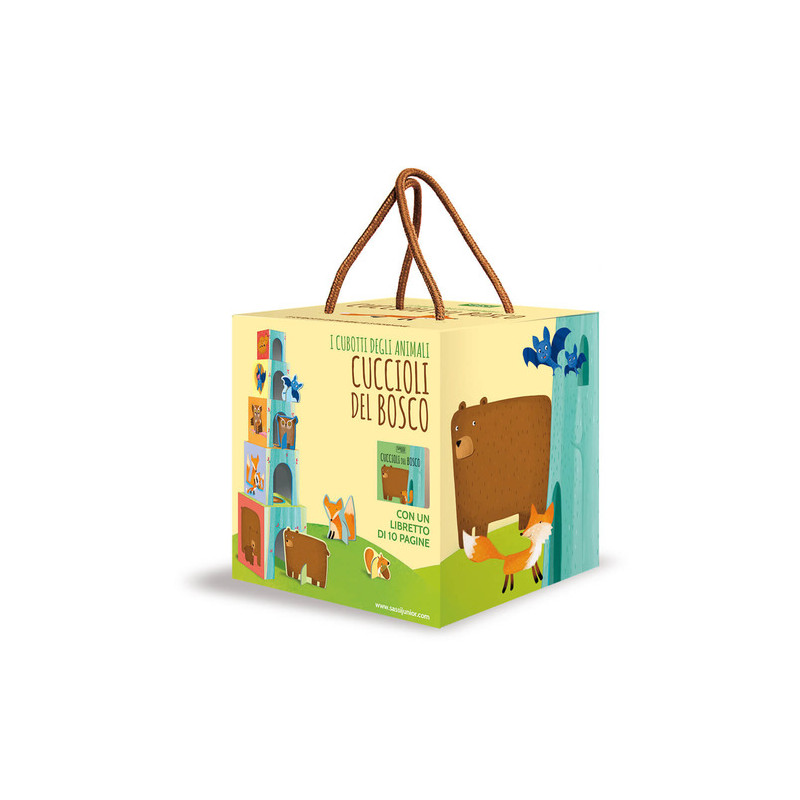 Nel fitto bosco sta arrivando l'ora di andare a dormire: segui i cuccioli dell'orso, del pipistrello, del gufo, dello scoiattolo e della volpe mentre tornano alle loro tane con la mamma e papà. Componi la torre di cinque cubi e gioca con altrettante formine di animali, poi leggi il libretto con le dolci rime dei cuccioli della foresta! Età di lettura: da 2 anni.