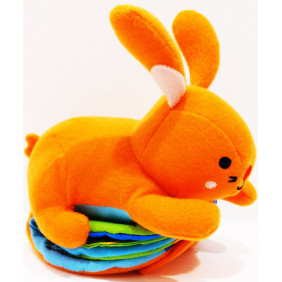 Peluche con libro di stoffa. Un simpatico coniglietto che comprende al suo interno un libro di stoffa con una storia semplice e divertente e un dispositivo di movimento a carica che permette di farlo "camminare" semplicemente tirando il cordino posto sul retro. Età di lettura: da 6 mesi.