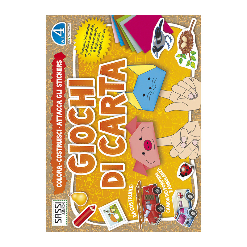 Gioco, colora, stupisciti! Questo album ti porterà subito in un mondo pieno di sorprese! Grazie a degli speciali fogli colorati per origami e ai numerosi stickers compariranno un passerotto, un corvo, il musetto di un maialino o di un gattino, una margherita, una busta da lettere e un portafoglio. Passo dopo passo ti spiegheremo, in modo semplice e chiaro, come realizzare ognuna delle 6 figure di carta utilizzando gli 8 fogli inclusi. Il divertimento continua con i disegni da colorare e da animare a tuo piacimento con gli origami e con i 54 stickers. All'interno troverai anche un camion dei pompieri e un'ambulanza - due modelli cartonati da costruire - pronti a viaggiare sulle strade di un grande tabellone, che potrà essere composto con i fondali che troverai negli altri album della serie "Giochi di carta". Età di lettura: da 5 anni.
