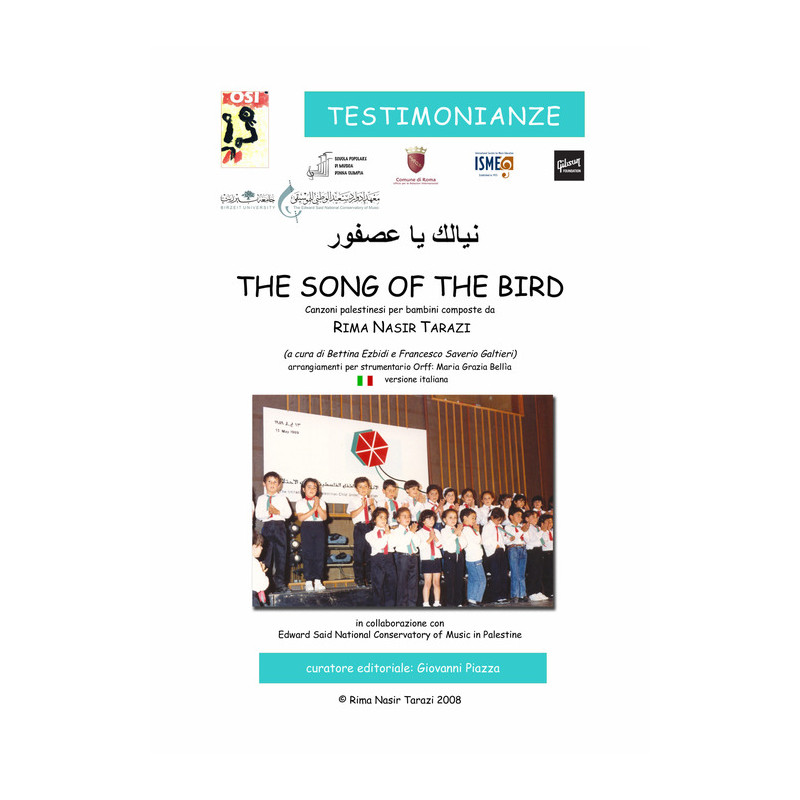 Canzoni palestinesi per bambini composte da Rima Nasir Tarazi (a cura di Bettina Ezbidi e Francesco Saverio Galtieri) Arrangiamenti per strumentario Orff: Maria Grazia Bellìa Versione italiano-arabo. Con "Song of the Bird" si apre una nuova sezione della collana OSI-MKT dedicata alle testimonianze provenienti da varie parti del mondo. In particolare questo primo fascicolo ci pone di fronte ad una realtà socio-culturale talmente distante dalla nostra da rischiare di restarne disorientati. Una testimonianza insolita in quanto riflessa nel contenuto di canti per bambini composti da una autrice e didatta palestinese. Una testimonianza alla quale, però, ci è sembrato importante accostarsi anche per meglio capire fenomeni di complessa relazione sociale di fronte ai quali ci troviamo sempre più spesso nell'ambito della nostra attività didattica, ormai decisamente multiculturale. Il fascicolo, attraverso un lavoro scientifico di documentazione, vuole raccontare la difficile situazione nella quale crescono oggi - e non da oggi - i bambini palestinesi e delle realtà con cui debbono confrontarsi.