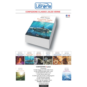 Confezione raccolta-promozionale dei seguenti romanzi di Jules Verne, con segnalibro: Viaggio al centro della Terra; Ventimila leghe sotto i mari; Dalla Terra alla Luna; Intorno alla Luna; Il giro del mondo in ottanta giorni; Michele Strogoff; L'isola misteriosa; I figli del capitano Grant. Età di lettura: da 10 anni.