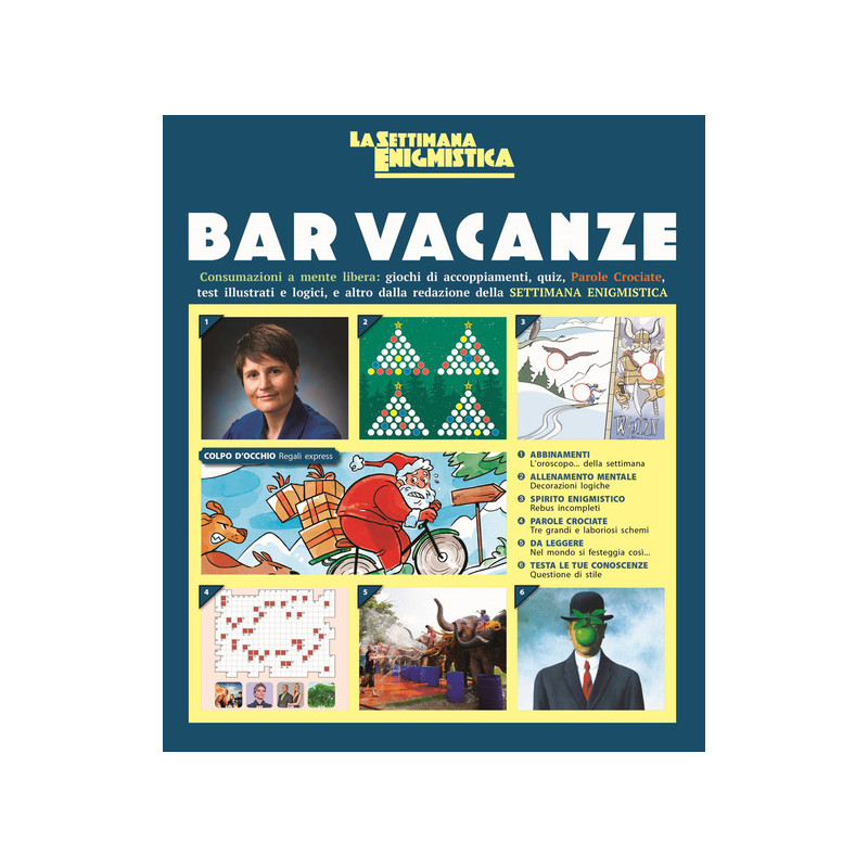 Dopo il volume pubblicato in estate, torna in libreria "Bar vacanze", il libro di giochi e passatempi edito da La Settimana Enigmistica. Nelle sue pagine sono proposte varie... consumazioni, tanti nuovi giochi ispirati alla recente attualità e altri che traggono spunto dai classici de La Settimana Enigmistica. Quiz, curiosità, Parole Crociate, rompicapo, enigmi, e altro ancora. Ogni gioco potrà essere risolto da soli o in compagnia, sfidando gli amici o tutti insieme, aiutandosi. Bar Vacanze... riaprirà in vista del Natale e la lista delle consumazioni sarà ampia: ognuno troverà senz'altro qualcosa di suo gusto.
