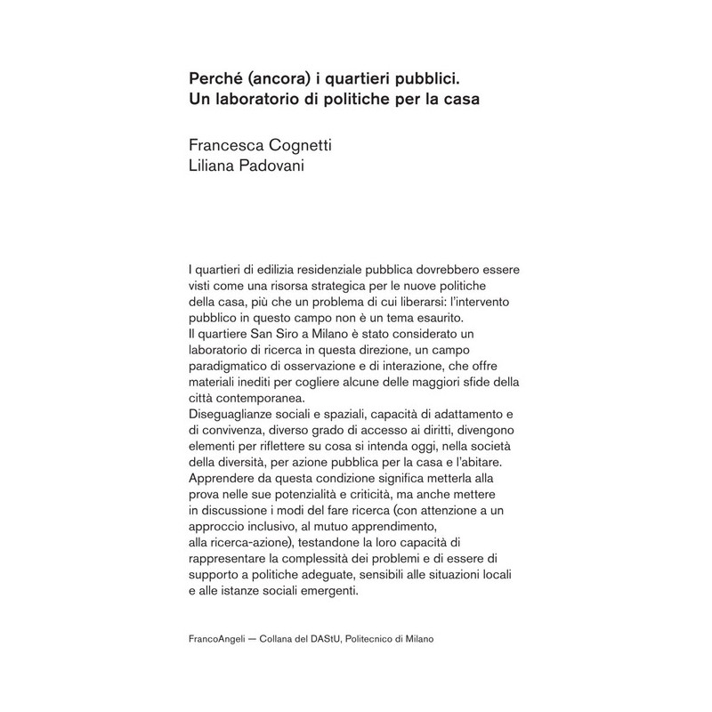 I quartieri di edilizia residenziale pubblica dovrebbero essere visti come una risorsa strategica per le nuove politiche della casa, più che un problema di cui liberarsi: l'intervento pubblico in questo campo non è un tema esaurito. Il quartiere San Siro a Milano è stato considerato un laboratorio di ricerca in questa direzione, un campo paradigmatico di osservazione e di interazione, che offre materiali inediti per cogliere alcune delle maggiori sfide della città contemporanea. Diseguaglianze sociali e spaziali, capacità di adattamento e di convivenza, diverso grado di accesso ai diritti, divengono elementi per riflettere su cosa si intenda oggi, nella società della diversità, per azione pubblica per la casa e l'abitare. Apprendere da questa condizione significa metterla alla prova nelle sue potenzialità e criticità, ma anche mettere in discussione i modi del fare ricerca (con attenzione a un approccio inclusivo, al mutuo apprendimento, alla ricerca-azione), testandone la loro capacità di rappresentare la complessità dei problemi e di essere di supporto a politiche adeguate, sensibili alle situazioni locali e alle istanze sociali emergenti.