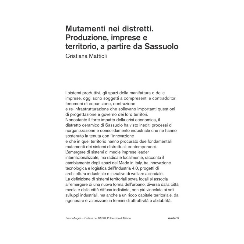 I sistemi produttivi, gli spazi della manifattura e delle imprese, oggi sono soggetti a compresenti e contradditori fenomeni di espansione, contrazione e re-infrastrutturazione che sollevano importanti questioni di progettazione e governo dei loro territori. Nonostante il forte impatto della crisi economica, il distretto ceramico di Sassuolo ha visto inediti processi di riorganizzazione e consolidamento industriale che ne hanno sostenuto la tenuta con l'innovazione e che in quel territorio hanno procurato due fondamentali mutamenti dei sistemi distrettuali contemporanei. L'emergere di sistemi di medie imprese leader internazionalizzate, ma radicate localmente, racconta il cambiamento degli spazi del Made in Italy, tra innovazione tecnologica e logistica dell'Industria 4.0, progetti di architettura industriale e iniziative di welfare aziendale. La definizione di sistemi territoriali sovra-locali si associa all'emergere di una nuova forma dell'urbano, diversa dalla città media e dalla città diffusa indistinta, non più vincolata ai soli sviluppi industriali, ma anche a un ricco capitale territoriale, da rigenerare e valorizzare in termini di attrattività e abitabilità.