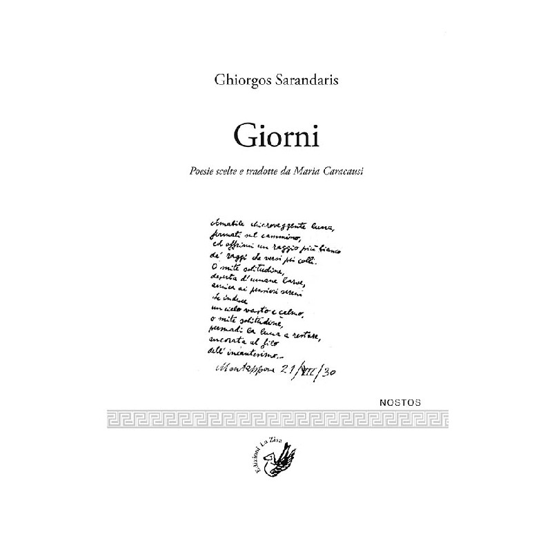 Il poeta greco Ghiorgos Sarandaris (1908-1941) si può considerare italiano d'adozione, poiché nel nostro Paese trascorse la maggior parte della sua breve vita. Nonostante l'amore per l'Italia e la sua cultura, non venne mai meno in lui un forte senso di appartenenza alla Grecia. Alla base della poesia di Sarandaris è il conflitto tra mondo reale ed ideale, tra esigenza di concretezza e aspirazione alla purezza ideale, all'assoluto. La poesia è per Sarandaris "l'unica conoscenza originale e immediata della realtà", uno strumento di conoscenza attraverso il quale giungere al Logos e cogliere il senso dell'esistenza. Amore e poesia, ricerca a tratti spasmodica dell'assoluto, dello spirito infinito nella finitezza della vita umana, sono la cifra per la comprensione della sua opera. In questa breve raccolta sono compresi diversi componimenti, dai primi esperimenti poetici fino agli ultimi mesi di vita del poeta. Non sappiamo, naturalmente, a quali sviluppi artistici avrebbe potuto condurre un'ulteriore maturazione,in un'esistenza più lunga, e possiamo solo dolerci che questa possibilità sia stata negata a Ghiorgos Sarandaris.
