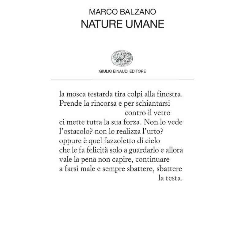 Altre esistenze, note a margine, mezze verità, testimonianze, particolari in controsenso: queste, e altre ancora, le immagini con cui Marco Balzano prova a classificare le poesie che lo accompagnano da molti anni (non tutti i suoi lettori sapranno che ha esordito appunto come poeta nel 2007) e che trovano ora, con quelle più recenti e inedite, una definitiva sistemazione nelle Nature umane che le raccolgono. Poesia che prova a scalfire la crosta dell'apparenza, come ha osservato Giampiero Neri; tensione gnomica che attraversa le parole, secondo il giudizio di Giancarlo Pontiggia; testi che indagano e custodiscono qualche scintilla di senso, di dubbio, di verità, e che si offrono al lettore come «le arance fasciate nella paglia», capaci di illuminare antichi e nuovi inverni. La scrittura poetica nasce qui dal dettaglio concreto, materico: l'oggetto improvvisamente colto dallo sguardo è interrogato dalla mente e dalla coscienza, e manifestato nel «rosario più scheggiato», quello delle parole, trasformandosi in un breve dispositivo ritmico che ne potenzia e moltiplica i significati, spiazza le aspettative, turba. La parola poetica, annotava Balzano in Le parole sono importanti (2019), «crea l'interpretazione»: si offre al lettore e lo impegna a non essere soltanto «animale senz'anima, nient'altro che vivente». Gli chiede di camminare «sotto il dirupo», ricordando (con profumo dantesco) che «in questa vigilia eterna la borraccia è la sola cosa che va tenuta stretta» (Fabio Pusterla).