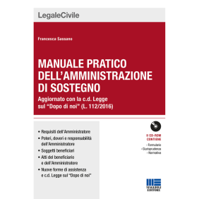 Il testo è un'analisi pratica dell'amministrazione di sostegno, istituto posto a tutela della persona che, per effetto di una infermità ovvero di una menomazione fisica o psichica, si trova nella impossibilità, anche parziale o temporanea, di provvedere ai propri interessi. L'opera, arricchita di giurisprudenza e formulario, tiene ampiamente conto delle disposizioni di cui alla L. 22 giugno 2016, n. 112 in materia di assistenza in favore di persone con disabilità grave prive del sostegno familiare (c.d. "Dopo di noi"). Oggetto di studio, anche attraverso l'esposizione di casi pratici, sono innanzitutto: i requisiti dell'Amministratore di sostegno; i beneficiari dell'amministrazione; i poteri dell'Amministratore e gli atti che questi può compiere; i doveri e le responsabilità dell'Amministratore; la competenza del giudice tutelare e i contenuti del decreto di nomina. Il volume prende poi in esame le forme di assistenza introdotte dalla L. 112/2016 alle persone con disabilità grave dopo la morte dei parenti che li accudiscono, ovvero detrazioni fiscali, trust e polizze assicurative agevolate. L'opera ha un taglio operativo, come risulta evidente dagli apparati proposti: appendice normativa con le disposizioni rilevanti in materia; rassegna giurisprudenziale che evidenzia le forme concrete in cui trovano applicazione gli istituti descritti; ricco e utile formulario, con atti editabili e stampabili anche su Cd-Rom allegato; utile memento con soluzioni riassuntive alle più frequenti questioni in materia di amministrazione di sostegno.