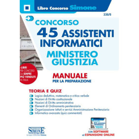 Il Manuale «Concorso 45 Assistenti Informatici nel Ministero della Giustizia» è diretto alla preparazione della prova preselettiva e delle prove scritte del concorso, entrambe basate su un questionario a risposta multipla. Il libro, pertanto, è cosi strutturato: Parte I, Quiz attitudinali; Parte II, Diritto costituzionale; Parte III, Diritto amministrativo; Parte IV, Ordinamento penitenziario e organizzazione degli istituti e servizi dell'amministrazione penitenziaria; Parte IV, Quiz commentati di informatica avanzata; Parte V, Questionari sulle materie giuridiche. La prova preselettiva si basa sulla risoluzione di un questionario a risposta multipla composto da domande: di carattere attitudinale, finalizzate alla verifica delle capacita logico-deduttive, di ragionamento logico-matematico nonché critico-verbale; sulle discipline giuridiche, quali Nozioni di Diritto costituzionale e amministrativo, con particolare riferimento al pubblico impiego. Le successive due prove scritte, poi, consistono ancora in un questionario a risposta multipla che verte su Elementi di Ordinamento penitenziario e organizzazione degli istituti e dei servizi dell'Amministrazione Penitenziaria e argomenti vari di Informatica avanzata. Di quest'ultima materia, considerata la particolare complessità e vastità, si forniscono esempi di quiz commentati tratti dai più recenti concorsi banditi per il reclutamento di informatici nella pubblica amministrazione. Il Manuale «Concorso 45 Assistenti Informatici nel Ministero della Giustizia» presenta inoltre espansioni online di approfondimento. Infine, grazie al software è possibile cimentarsi in infinite simulazioni delle prove d'esame.