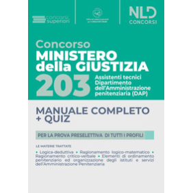In data 29 Marzo 2022, nella Gazzetta Ufficiale della Repubblica Italiana, è stato pubblicato un Bando di concorso indetto dal Ministero della Giustizia per l'assunzione a tempo indeterminato di 203 Assistenti tecnici al Dipartimento dell'Amministrazione penitenziaria. Le 203 unità sono così suddivise: 50 posti nel profilo professionale di Assistente Tecnico - Edile (codice concorso TE01); 48 posti nel profilo professionale di Assistente Tecnico - Elettronico (codice concorso TE02); 50 posti nel profilo professionale di Assistente Tecnico - Elettrotecnico (codice concorso TE03); 49 posti nel profilo professionale di Assistente Tecnico - Meccanico (codice concorso TM04); 6 posti nel profilo professionale di Assistente Tecnico - Agrario (codice concorso TA05). La procedura di selezione prevede le seguenti fasi: Prova preselettiva (eventuale); Prova scritta; Prova orale. La prova preselettiva consisterà in una serie di domande di carattere attitudinale finalizzate alla verifica della capacità logico-deduttiva, di ragionamento logico matematico e critico-verbale ed una serie di domande vertenti su elementi di ordinamento penitenziario ed organizzazione degli istituti e servizi dell'Amministrazione Penitenziaria. Il presente volume costituisce uno strumento per la preparazione alla prova preselettiva del concorso, contenendo una sintetica ma dettagliata trattazione teorica delle materie sopraindicate, accompagnata da una accurata e ricca selezione di quesiti a risposta multipla. Completa il volume il simulatore online con il quale è possibile esercitarsi con batterie di domande a risposta multipla su tutte le materie del testo, consultabile con apposita password.