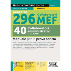Manuale di preparazione al Concorso 296 collaboratori MEF. Pubblicato in Gazzetta Ufficiale concorsi ed esami n. 104 del 31 dicembre 2021 il concorso RIPAM, per titoli ed esami, per l'assunzione a tempo indeterminato di 296 funzionari nei profili dei ruoli del Ministero dell'Economia e delle Finanze. I 296 posti sono così ripartiti: n. 198 profilo collaboratore amministrativo-contabile; n. 58 profilo collaboratore tributario; n. 40 profilo collaboratore amministrativo. Questo volume è rivolto a coloro che si preparano ad affrontare la prova scritta per collaboratori amministrativo contabili (codice concorso CONT) e per collaboratori amministrativi (Cod. AMM). La prova scritta, distinta per i codici concorso, consiste in un test di quaranta quesiti a risposta multipla da risolvere in sessanta minuti. Il manuale Concorso 296 Collaboratori MEF - 40 Collaboratori amministrativi (Cod. AMM) è indirizzato a coloro che devono affrontare la prova scritta del concorso bandito in G.U. 31-12-2001, n. 104. Il testo, seguendo il programma del bando, tratta le materie oggetto della prova scritta - che consiste in un test di 40 quesiti a risposta multipla - ossia: Diritto amministrativo con riferimento ai contratti pubblici e alla normativa in materia di trasparenza e protezione dei dati personali; Rapporto di pubblico impiego, organizzazione e management delle pubbliche amministrazioni. L'anticorruzione; Elementi di diritto dell'Unione europea; Contabilità di Stato e degli enti pubblici; Test situazionali commentati; Inglese, Informatica e Logica (solo quiz su software). Il manuale è corredato da numerose risorse online: Espansioni semplificate per chi non ha mai studiato diritto. Approfondimenti e normativa d'interesse. Un software con quiz a risposta multipla su tutte le materie oggetto della prova per esercitarsi in infinite simulazioni.