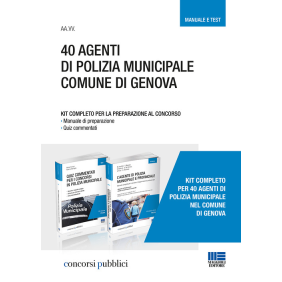 È stato pubblicato il bando di concorso per la selezione pubblica di 40 Agenti di Polizia Municipale nel Comune di Genova, cat. C1, da assumere a tempo pieno e indeterminato. Il presente kit contiene i due volumi: il manuale "L'agente di polizia municipale e provinciale"; la raccolta di quiz a risposta multipla "Quiz commentati per i concorsi in polizia municipale". La combinazione delle due opere garantisce una preparazione completa per affrontare al meglio il concorso. L'iter concorsuale prevede: prova preselettiva: quiz a risposta multipla sulle materie indicate dal bando; prova di efficienza fisica per verificare il possesso delle qualità fisiche dei candidati; prova scritta: quiz a risposta multipla sulle materie indicate dal bando; prova orale: colloquio sulle materie della prova scritta e altri argomenti indicati dal bando, accertamento della conoscenza della lingua inglese e della conoscenza di base dell'uso delle applicazioni informatiche più diffuse.