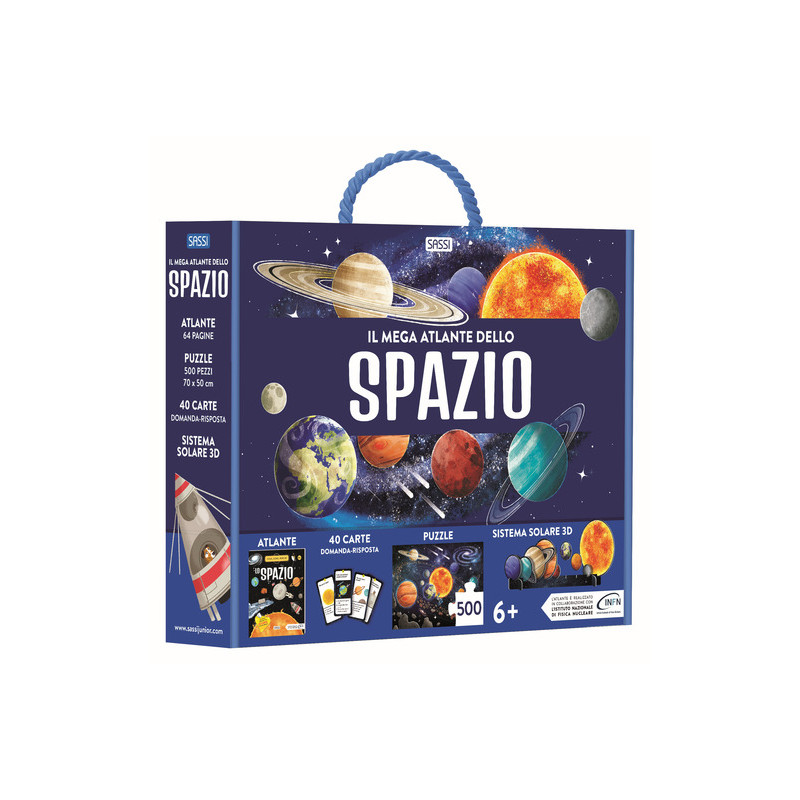 L'uomo ha sempre guardato al cielo con stupore e curiosità. Dopo decenni di studi ed esplorazioni, lo Spazio custodisce ancora tanti misteri da svelare. Sfoglia l'atlante ricco di interessanti informazioni e soddisfa i tuoi interrogativi sull'Universo che ci circonda! La scatola contiene un atlante di 64 pagine, 40 carte con quesiti scientifici, un modellino 3D del Sistema Solare e un puzzle gigante da 500 pezzi per scoprire i segreti dello Spazio. Autori: Irena Trevisan, Valentina Bonaguro, Alberto Borgo, Nadia Fabris, Enrico Lorenzi, Mattia Cerato. Età di lettura: da 6 anni.