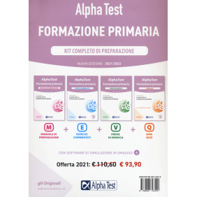 L'edizione 2021/2022 di questo kit è la soluzione più completa e aggiornata per prepararti ai test di ammissione di Scienze della Formazione Primaria. Ogni libro prevede la trattazione di tutti gli argomenti oggetto d'esame: competenza linguistica e ragionamento logico, cultura letteraria, storico-sociale e geografica, matematico-scientifica e pedagogica. Il kit comprende: il manuale, con la teoria essenziale per studiare o ripassare ogni argomento richiesto al test; un eserciziario con centinaia di domande risolte e commentate per chiarire ogni dubbio; le prove di verifica aggiornate per simulare l'esame e mettersi alla prova; una raccolta di migliaia di domande ufficiali suddivise per materia con tutte le soluzioni. Il software Alpha Test Player permette di svolgere infinite esercitazioni e prove simulate secondo le modalità dell'esame ufficiale, attingendo sia dai quesiti commentati dell'eserciziario sia dal ricco archivio della raccolta di quiz. I risultati sono immediatamente disponibili e vengono presentati anche in forma grafica.