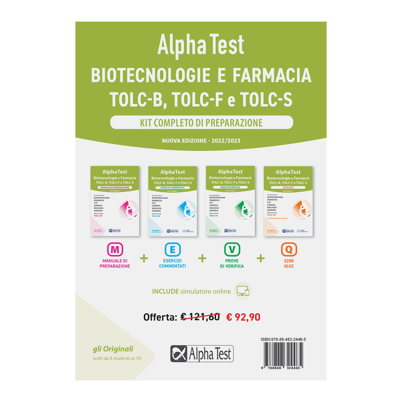 La nuova edizione 2022/2023 di questo kit è una soluzione completa, conveniente e aggiornata per la tua preparazione ai test di ammissione a Biologia, Biotecnologie, Farmacia, Chimica, Agraria, CTF. Il kit è valido anche per la preparazione del Test Nazionale CISIA di Scienze. 4 i libri a tua disposizione: Manuale di preparazione per lo studio di tutte le conoscenze teoriche richieste dal test di Biologia, Biotecnologie, Farmacia, Chimica, CTF, con esercizi esemplificativi tratti dalle prove ufficiali degli ultimi anni; Eserciziario commentato con centinaia di quesiti suddivisi per argomento e aggiornati ai test degli ultimi anni e alle più recenti direttive ministeriali; Prove di verifica con 10 simulazioni di test composte da domande provenienti dai test degli ultimi anni e raccolte in un unico volume; i quesiti delle prove di ammissione con 3200 domande suddivise per materia con tutte le soluzioni. Include simulatore online.